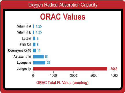 We use Coffeeberry® in our Longevity because of its powerful beneficial effects on your immune system and its ability to destroy free radicals that cause damage inside your body because of its high ORAC value.  We also included other specific nutrients to create a very powerful antioxidant combination that has a very high ORAC value, which gives you the best opportunity at destroying free radicals and staying disease free.